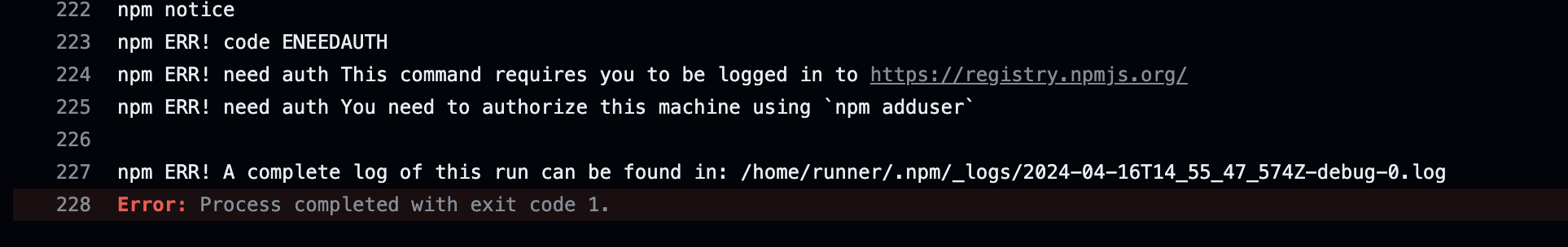 로컬에서 npm publish를 진행할 때는 로그인이 되어있는 상태였기 때문에 문제가 발생하지 않았지만, github action에서는 로그인 NPM_TOKEN을 넣어주지 않을 시 인증 에러가 발생하였다.